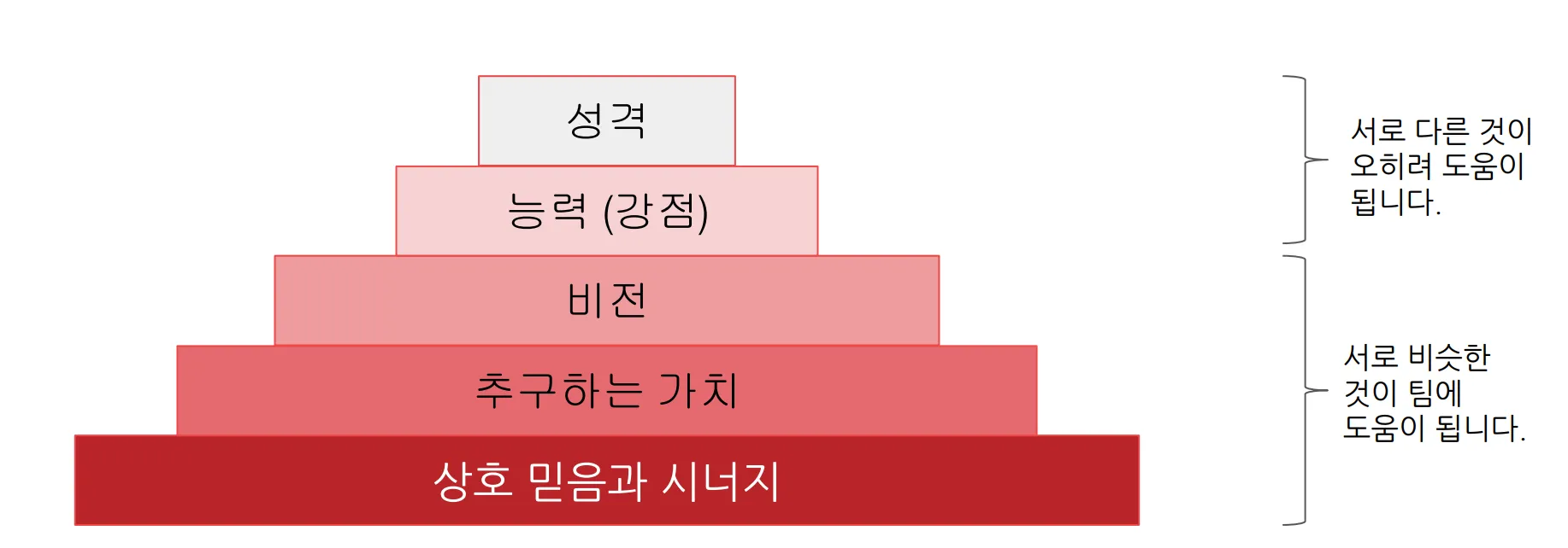 • 상호 보완적인 능력 뿐만 아니라 가치관이나 비전이 서로 일치하고 팀 구성원 간의 시너지가 중요합니다.