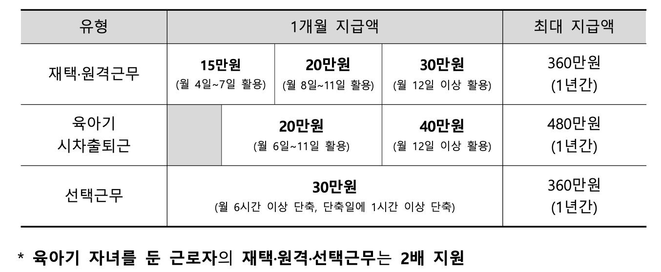- 재택·원격근무: 월 4일~7일 활용 시 10만 원, 8일~11일 20만 원, 12일 이상 30만 원